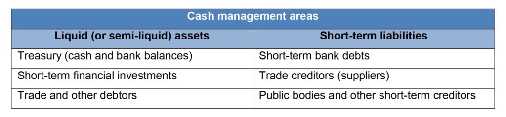 Cash management comprises the areas of the balance sheet that we know as liquid (or semi-liquid) assets and short-term liabilities.