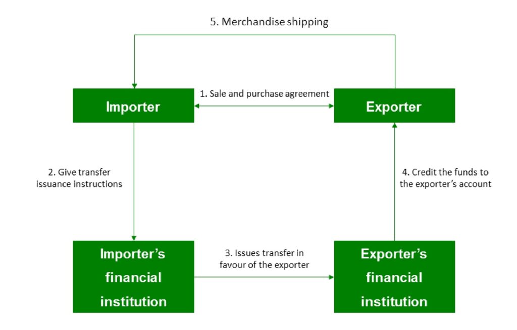 In an international transfer, the importer instructs their financial institution to make a demand payment in favour of the exporter.