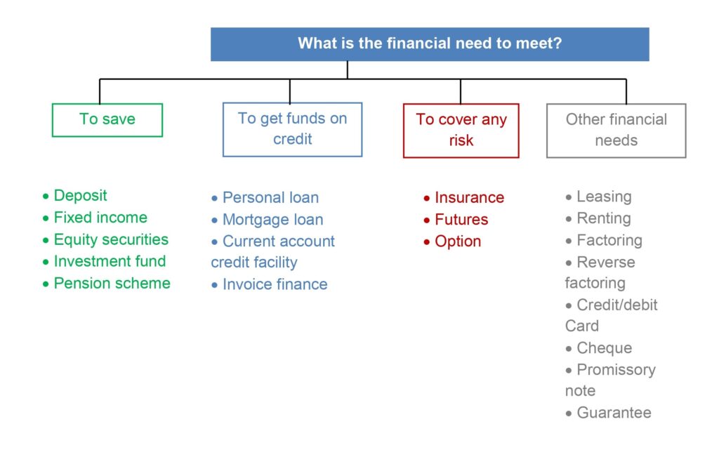 The different categories of financial products can be determined according to the needs they meet, as established in the following diagram: